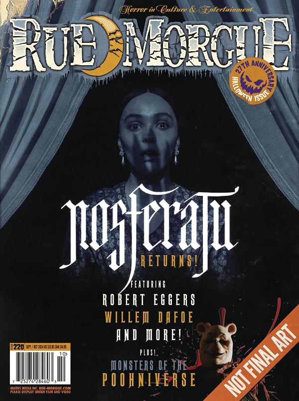 RUE MORGUE rings in its milestone 27th ANNIVERSARY HALLOWEEN DOUBLE ISSUE #220, featuring a look at the legacy of the vampire with the various iterations of NOSFERATU including the upcoming remake of the controversial 1922 original. Features interviews with ROBERT EGGERS, WILLEM DAFOE, a look back at 100 years of Nosferatu and lots more! Also features: the Vilest Villains in Cinema; a Gothic cookbook; SPEAK NO EVIL and lots more!