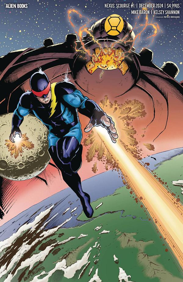 The Eisner Award-winning science fiction vigilante is back in a universe-shattering tale that's essential for all Nexus fans! Mike Baron and Steve Rude's Nexus enters a new era with classic characters and an all-new villain that's destroying the universe one planet at a time. It's a breathtaking new vision for the Nexus Universe by series co-creator Mike Baron and up and coming artist Kelsey Shannon (Batman Adventures, GI Joe). Nexus: Scourge is an all-new era of Nexus; a two-issue event by Mike Baron and Kelsey Shannon exclusively from Alien Books! Planet destroying action and a wry wit that's perfect for fans of Hitchhiker's Guide to the Galaxy and classic Doctor Who.
