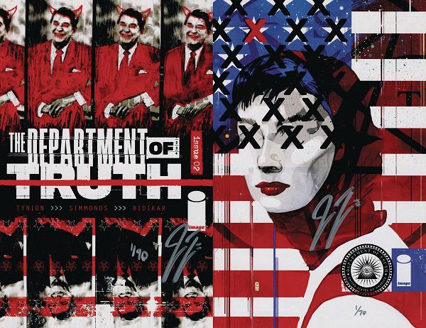 COLE TURNER has spent most of his life suppressing false memories of Satanic ritual abuse at his preschool. Now, he's the newest recruit of the Department of Truth...and he just found out those false memories might be truer than he thinks. JAMES TYNION IV (Batman, Something is Killing the Children) & MARTIN SIMMONDS (Dying is Easy) continue their breakout conspiracy thriller! This special set includes 2 versions of DEPARTMENT OF TRUTH #2, each signed by JAMES TYNION IV in silver ink. SUPPLIES ARE EXTREMELY LIMITED. ALLOCATIONS WILL OCCUR.
