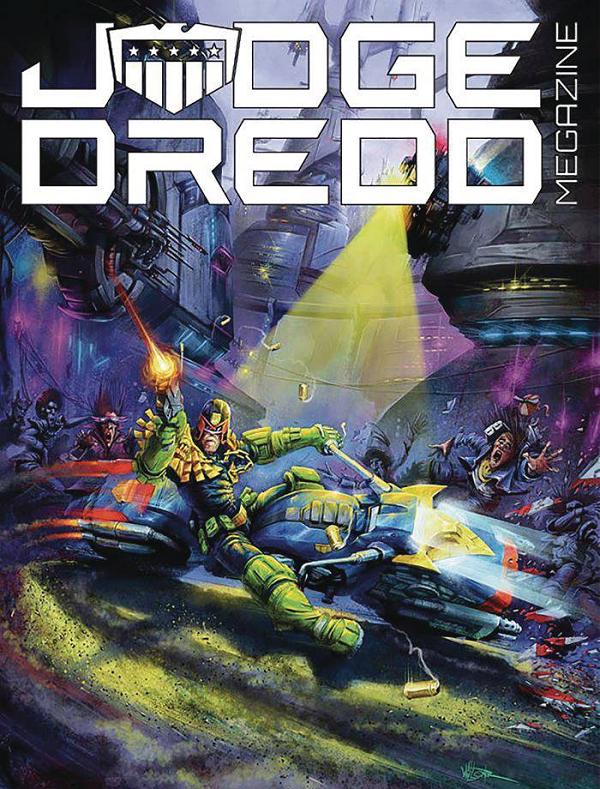 More action and adventure in the future-shocked world of Judge Dredd! Dredd lays down the law on the A.I. entity in "Messiah Complex" by Ian Edginton & Paul McCaffrey; plus there's more thrills and spills in Lawless by Dan Abnett & Phil Winslade; Devlin Waugh: "Two Months Off" by Ales Kot & PJ Holden; Death Cap: Frontier Justice by T.C. Eglington & Boo Cook; Fargo & McBane: "New York's Finest" by Ken Niemand & Anna Readman. Plus features, interviews and lots more!