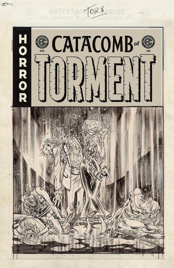 Is winter's woe upon thee? Come on into the CATACOMB OF TORMENT—where our horrific hostess, the Tormentor, always keeps the pyre roaring! Take sickly comfort in three bloody new tales of miserable merriment in the immortal EC Comics mold—hauled out from the depths of the Tormentor's catacomb and fiendishly stitched together by caustic creators Rafael Scavone (Hit-Girl) & Rafael Albuquerque (American Vampire), Paul Tobin (The Witcher) & Arjuna Susini (Lamentation), and Robert Menegus (Necromancer Bill) & Valeria Burzo (High Strangeness)! Winter may be coming to an end, but EC Comics NEVER DIE!