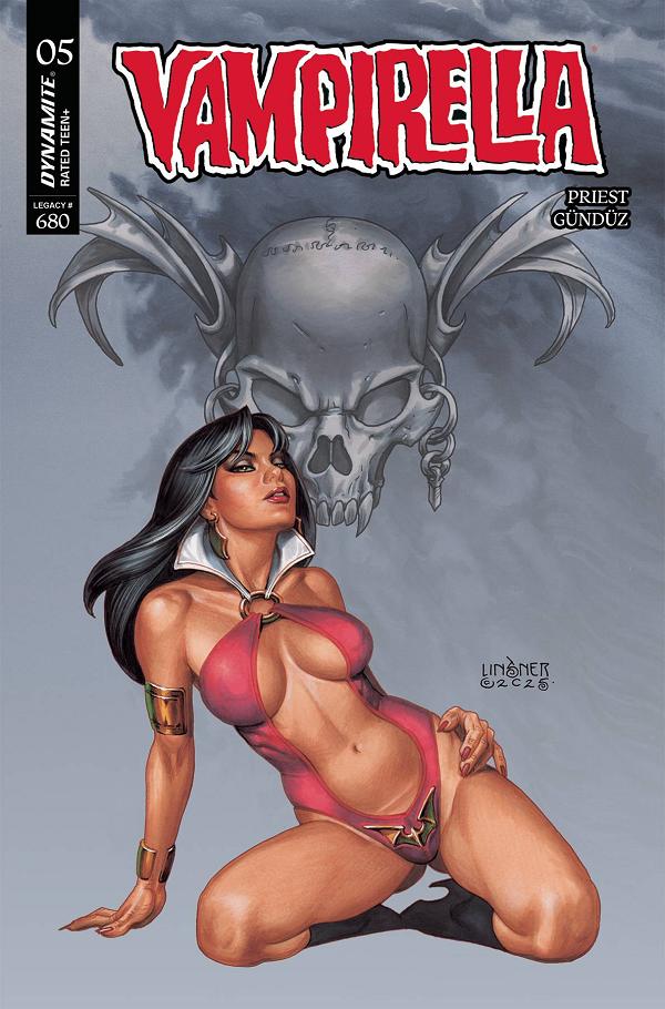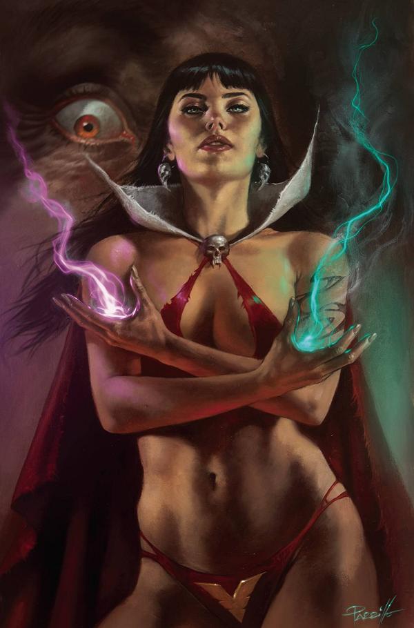 DARKNESS CLOSES IN! In an all-too-possible future following a global apocalypse, a vengeful Vampirella seizes power and imposes a crushing totalitarian order over the entire Earth - leaving her son Cicero with no other choice but to turn to evil to stop her. Meanwhile, in the foreboding present, a cyberpunk Baron Von Kreist arrives from the future, hell-bent on preventing Cicero from disrupting the coming dark future - by any means necessary! Sage prognosticators CHRISTOPHER PRIEST and ERGÜN GÜNDÜZ proffer eerily accurate extrapolations in Vampirella #5 - enhanced by enticing covers from LUCIO PARRILLO, GREG LAND, JOSEPH MICHAEL LINSNER, ELIAS CHATZOUDIS, and cosplay by RACHEL HOLLON!