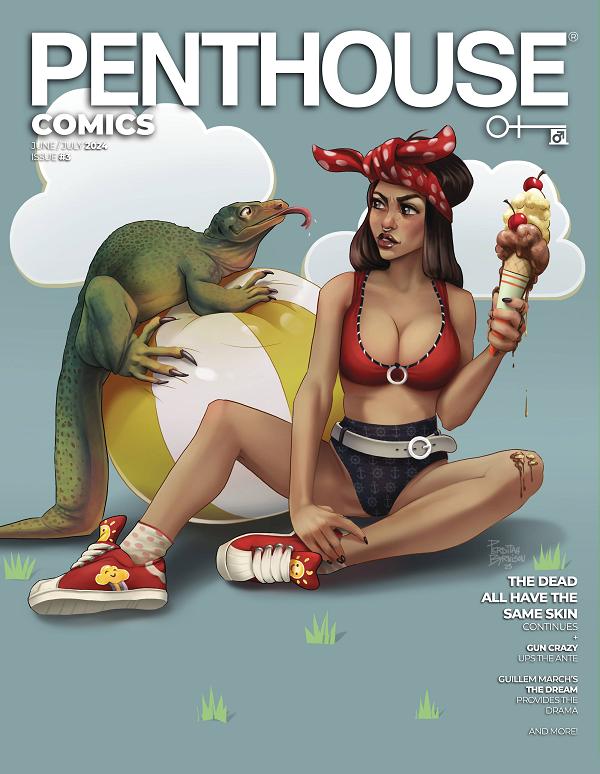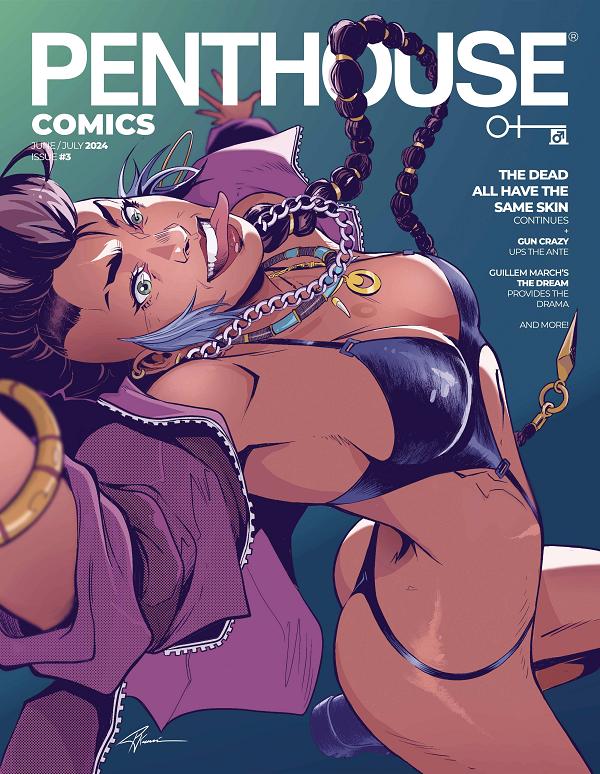 Cover art by Matteo Scalera. A Penthouse Comics regular, Matteo is known for his work for all major publishers on titles like Batman, Power Rangers, Black Science, and many more. Releasing 30 years after the original line debuted, Penthouse is proud to present the ongoing return of Penthouse Comics! Featuring a wealth of talent from all across the industry telling stories in the action, thriller, and horror genres, issue #3 continues the ongoing tales. Gun Crazy continues with the wild ride of Dolly Sanchez and Lanoya O'Brien, two girls fighting for survival in this violent story in the crossroads of Tarantino, VHS stuff, and the 80's. Guillem March continues with his incredible artwork on The Dream , a tale about Megan, a Hollywood casting director who attempts to bring out the potential actor hidden deep inside a stripper in the San Francisco suburbs. I Spit On Your Grave , is an adaptation of Vernon Sullivan's famous novel about Lee Anderson, whose only goal is to avenge the death of his brother. Along the way he'll fall into a life of debauchery and sex. The Dead All Have The Same Skin , continues with its tale about a mixed race bouncer in old world New York who must hide his identity to keep being accepted by society. But his brother, Richard has other plans. As always, Penthouse Comics features a bonus photoshoot and editorial!