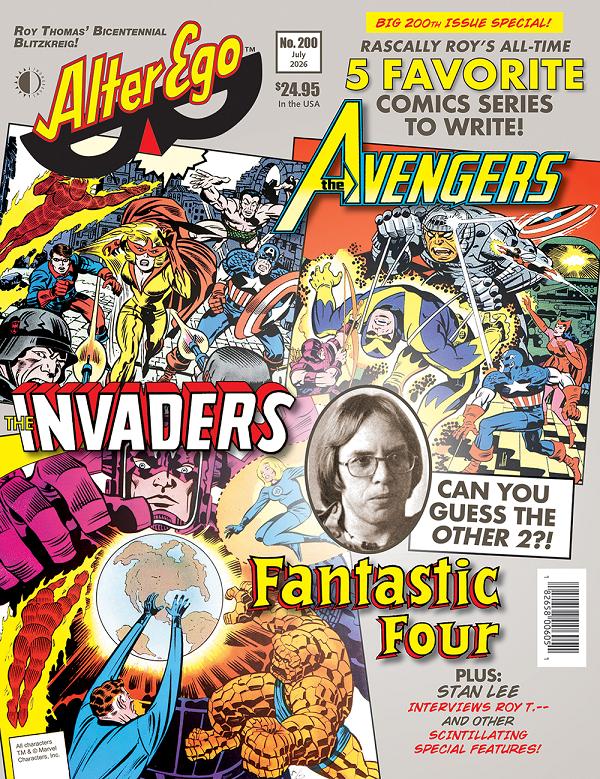 Alter Ego #200 is a double-size bicentennial blitzkreig of Bronze Age comics history! A/E editor/co-founder Roy Thomas talks in-depth about his five favorite all-time comics series to write: All-Star Squadron, Conan the Barbarian, The Avengers, The Invaders, and Fantastic Four! With surprise interviews by Richard Arndt, and awesome art by the Brothers Buscema (John and Sal, natch!), Barry Windsor-Smith, Gil Kane, Jerry Ordway, Rich Buckler, Frank Robbins, George Pérez, Don Heck, Gene Colan, et al.! Plus a special installment of FCA (Fawcett Collectors of America), Michael T. Gilbert in Mr. Monster’s Comic Crypt—and lots more!