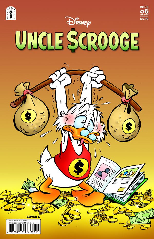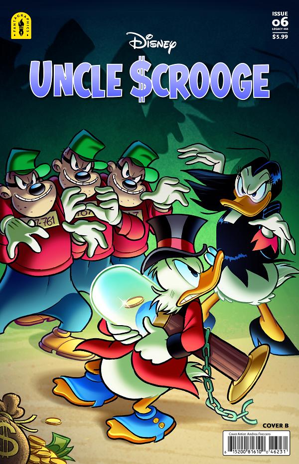 Wave your black-magic wand—and watch your back! In “By Moonlight’s Blight,” Magica De Spell’s latest anti-Scrooge scheme calls for a dark crystal that will send Scrooge to the ends of the earth… but when spells get misspelled, Magica and Scrooge both end up on a dragon-ravaged desert island. Who beats who to escape first? Then, when the Beagle Boys try to “Make Money in Your Sleep,” Scrooge and Gyro Gearloose are the targets—but those get-rich dreams turn into nightmares!