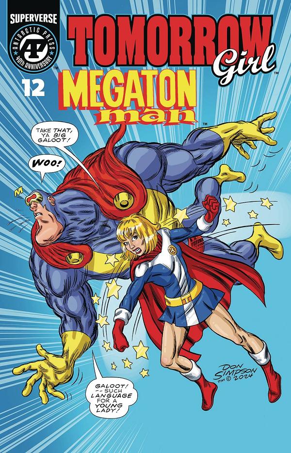 SUPERVERSE TITLE! MEGA-JAW-DROPPING, MEGA-MIGHTY CROSSOVER! AMERICAN MANGA SUPERHERO! "Tomorrow Girl X Megaton Man" (Larry Guidry, Ben Dunn, Nick Webb), "The Origin of Tractor Lad" (Dan Collins), "The Scarlet Phantom" (Paul Beale). "Tomorrow Girl X Megaton Man" (Larry Guidry, Ben Dunn, Nick Webb): Woo! By special arrangement with creator Don Simpson, Tomorrow Girl finds herself in a pitched battle with the mega-big, mega-bad, mega-jawed Megaton Man! But has he turned evil, or is there another power at play? Plus "The Scarlet Phantom" (Paul Beale) and part 2 of "The Origin of Tractor Lad" (Dan Collins)!
