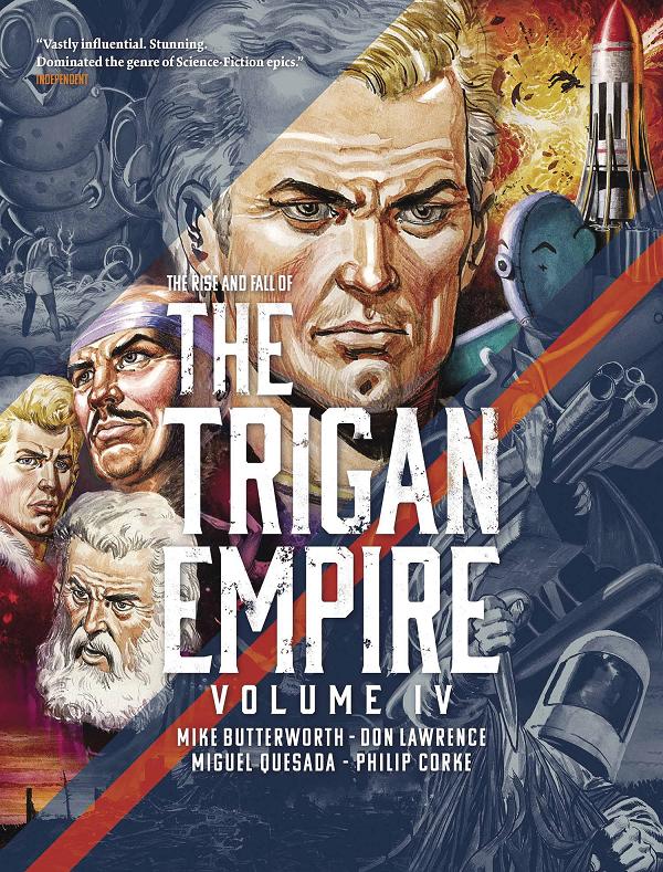 The best-selling Treasury of British Comics archival series The Rise and Fall of the Trigan Empire reaches its fourth astounding volume. Don Lawrence's painted art continues to be a highlight of the series, and as he takes a sabbatical from the strip Miguel Quesada and Philip Corke match his impressive work with their own style. The Trigan Empire remains resilient against enemies on all fronts, from treacherous politicians, murderous Zith assassins, and alien invaders, Trigo and Janno protect the citizens of Elekton. The omnibus collects the stories published from 1973 through to 1976.