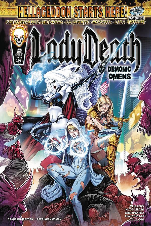 Chapter 19 (Part 2) in the Coffin Comics Lady Death Universe. Hellageddon has arrived! After the tragic conclusion of Imperial Requiem, Lady Death returns to "our" Earth only to discover two years have passed and unprecedented prosperity has spread across the globe. But soon this peace is slashed to bloody pieces. A savage demonic cult emerges, bent on chaos and destruction. Now, Lady Death must race against time and battle demonic forces to save a trusted friend from an unspeakable fate. Watching from the shadows, Satanus devises a nefarious plan to dominate the world and bring Lady Death to her knees. Has Lady Death met her match?
