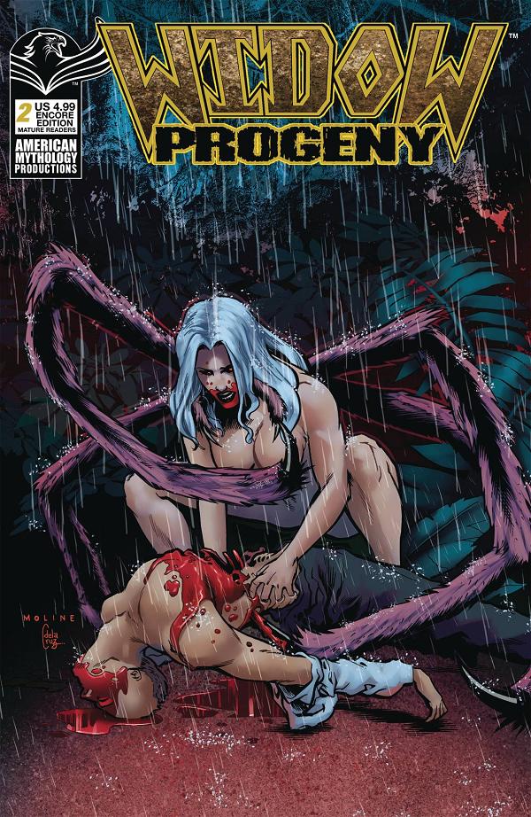 Mike Wolfer's erotic/horror, cult classic WIDOW series roars back to blood-curdling life with this shocking tale of lust, survival, and mutant spider creatures with a hunger for human flesh, available for the first time in an American Mythology Encore Edition variant! When a US Coast Guard helicopter crash lands on a remote Caribbean island, the crew find not only a beautiful shipwreck survivor, but a horde on hideous monsters intent on devouring them all. Karl Moline's stark, black and white art is hand-painted in gray tones by Mike Wolfer, giving this WIDOW series a decidedly Gothic horror feel, making it unlike any other comic on the stands! This edition contains all-new, never-before-seen, black and white pin-up art! For mature readers only!