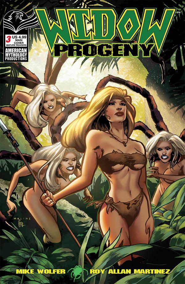 The long-awaited conclusion to the gore and lust-filled Widow spin-off series is finally here! One by one they have fallen, victims of the ravenous appetites of the spider-like, cannibalistic monstrosities, and now in the shocking, mini-series conclusion, CPO Israel Thorne and the shipwrecked Katy will make their last stand against the horde of monstrous spider-creatures that inhabit the island on which they are stranded. Their only hope for survival lies in the hands of the beautiful triplets, Rain, Pretty, and Blue. But will the trio's uncontrollable urges to transform into arachnid beasts and feast on human flesh spell ultimate doom for Thorne and Katy? Featuring interior art by horror superstar Roy Allan Martinez (Eternal Thirst of Dracula, Zorro: Swords of Hell), this shocking tale is for mature readers only, and features nudity, gore, and more hideous spider-creatures than you've ever seen! Widow Progeny #3 is available in two covers - Main and Psycho '70s by Karl Moline.