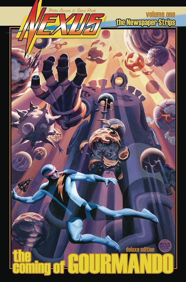 Having narrowly evaded the world-destroying being known as Gourmando, Nexus is now confronted with the formidable task of his planet's reconstruction. Still concerned about the long overdue absence of his beloved friend, Dave, Nexus finds himself dealing with the added nuisance of Earth journalist, Nipsey Conniption, suspicious of his immense powers and determined to disgrace him within her loyal galaxy of followers. Steve Rude revives Nexus in a new comic strip format, as he takes on the roles of writer, penciller, letterer, inker, and cover artist.