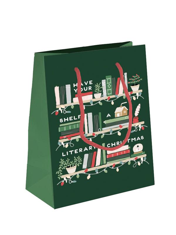 Have Your Shelf a Literary Christmas Gift Bag Embrace the festive spirit and the love of literature with this gift bag. Have yourself a merry little Christmas, and let the pages turn with joy! This thoughtfully curated gift bag combines the magic of the holiday season with the timeless joy of reading, making it the perfect present for anyone who loves to get lost in a good book. Product Details Material: Paper Ribbon handle Dimensions (overall): 12.75" (H) x 10.25" (W) x 5.75" (D)