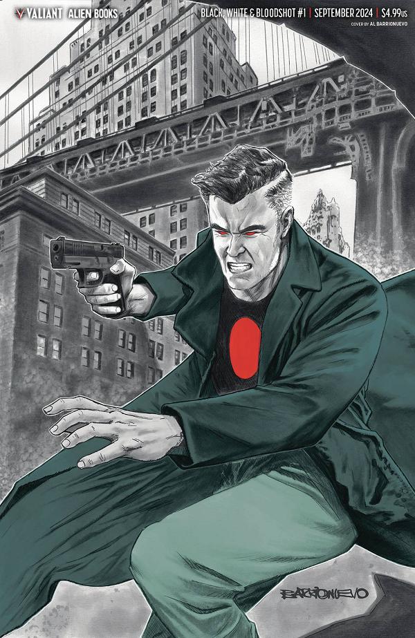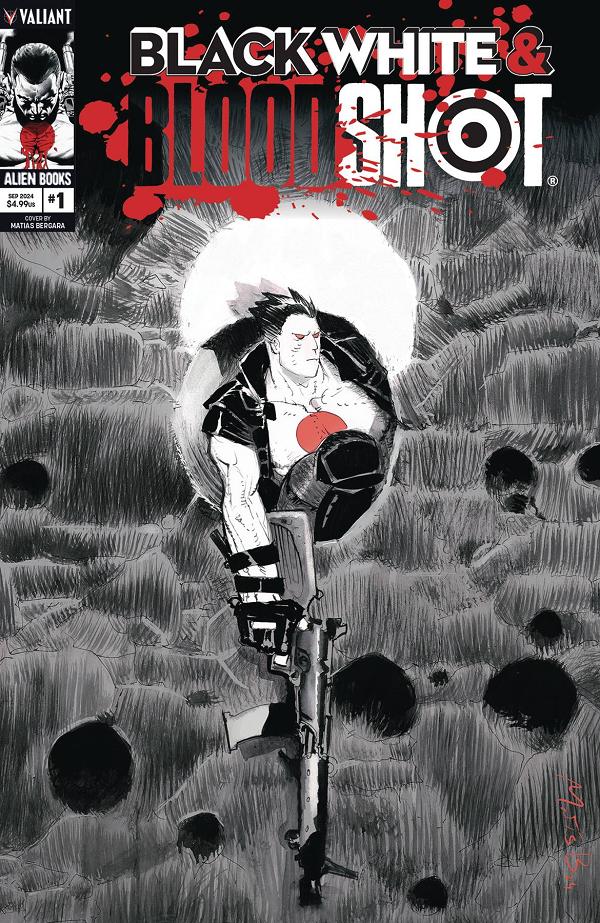 Enter the world of Bloodshot in this brand-new Black, White, and Blood anthology! Meet Bloodshot, the world's deadliest assassin! A super soldier engineered with Nanites, a versatile nanotechnology that allows Bloodshot to repair the damage inflicted on his body, change his appearance, and control machines. From the creative minds of some of the world's most renowned creators like Shintaro Kago, Brian Azzarello, Eduardo Risso, Ariel Olivetti, Kevin Van Hook, Marc Guggenheim, Tim Seeley, Danny Earls, Fernando Dagnino, David Baille, Timmy Heague, Luciano Saracino, Guillermo Fajardo, Joao Azeitona, Renato Guedes, Mico Suayan and many more! In this first issue, Bloodshot is put to the limit when scientists try to farm never-ending meat from his self-repairing body to stop hunger in the world. Experience Bloodshot's feelings as he confronts his demons in a deadly mission in the desert... And what will happen when a serial killer interrupts his favorite new movie at the theater? Then, for the first time, the crossover nobody was asking for: it's Bloodshot versus... Mickey M? Each tale deeply explores Bloodshot's psyche, tackling themes of identity, justice, and sacrifice in a world saturated with black, white, and blood-red shades.